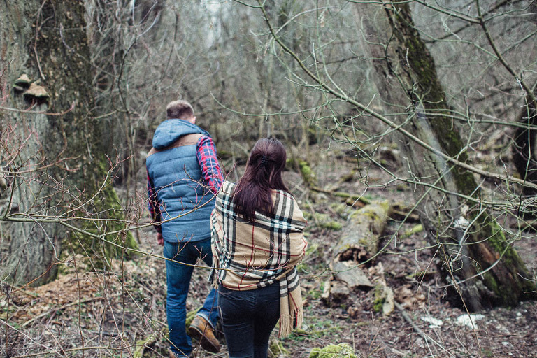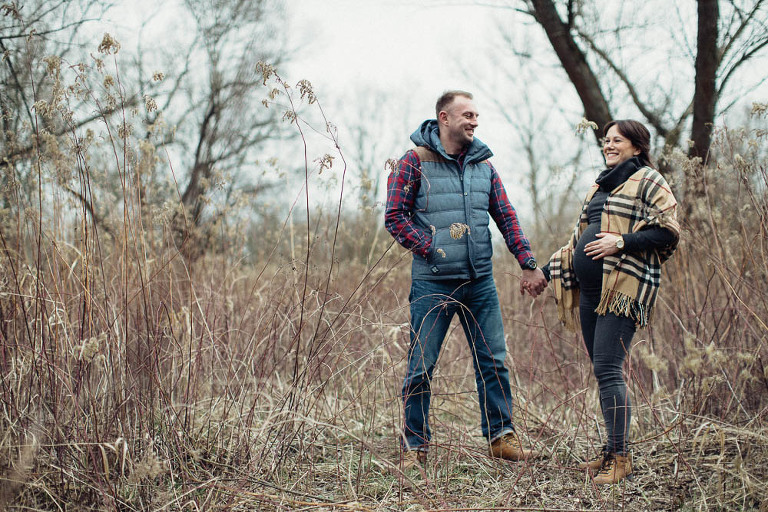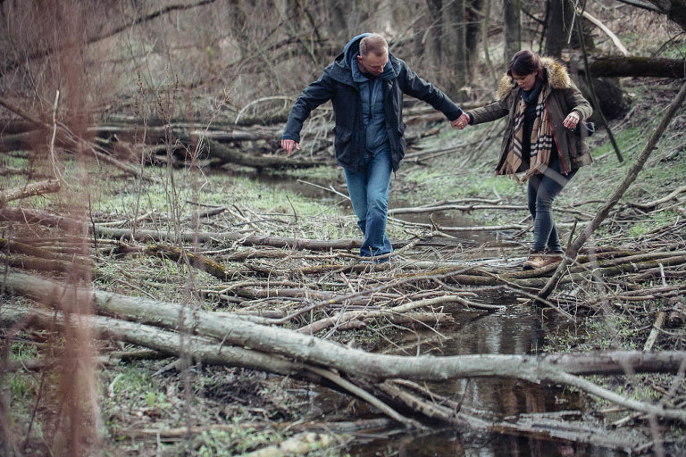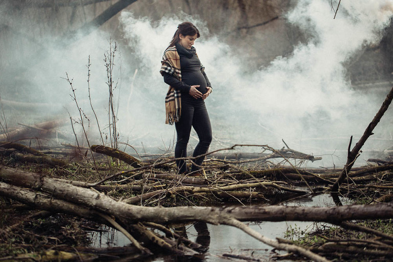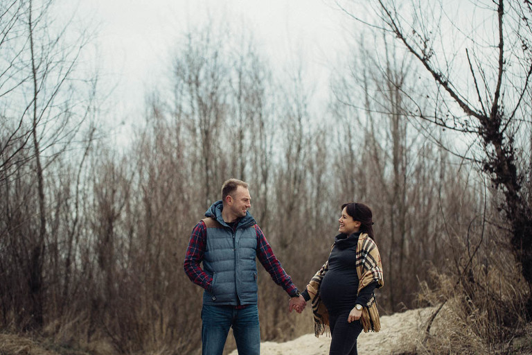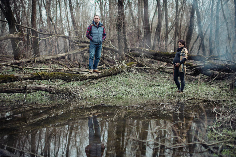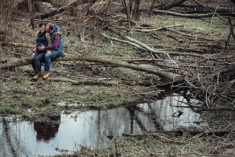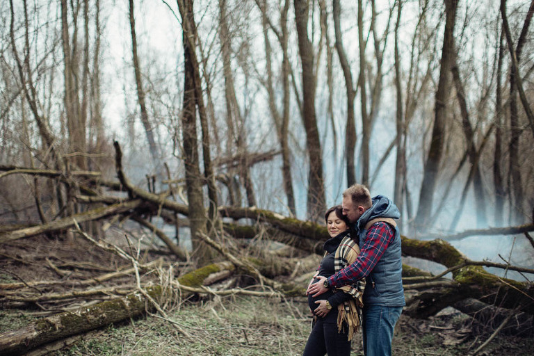 Miało być niestandardowo dla tego typu zdjęć. Ada z Marcinem nie chcieli kolejnej przytulonej, słodkiej sesji ciążowej z małymi bucikami stąpającymi po brzuszku, jakie mogli zaobserwować w Internecie. Mimo iż tego typu fotografię też mają jakiś swój urok, to padł jednak pomysł aby zrobić zdjęcia w plenerze, ale w nieoczywistej scenerii a wręcz przeciwnie, w bardziej mrocznym otoczeniu. Okres końcówki zimy idealnie do tego się nadawał, z resztą nie było innej możliwości gdyż termin porodu się zbliżał. Tak więc udaliśmy się do lasu gdzie rozpuszczony śnieg tworzył dość grząski teren, a w niektórych miejscach mieliśmy wrażenie, że znajdujemy się na jakiś mokradłach. Nie było lekko, i mimo że teren był dość ciężki oraz momentami wiał dość silny chłodny wiatr, to dzielnie znosili oni moje propozycję. I tak oto powstała ta krótka nietypowa sesja ciążowa w plenerze.